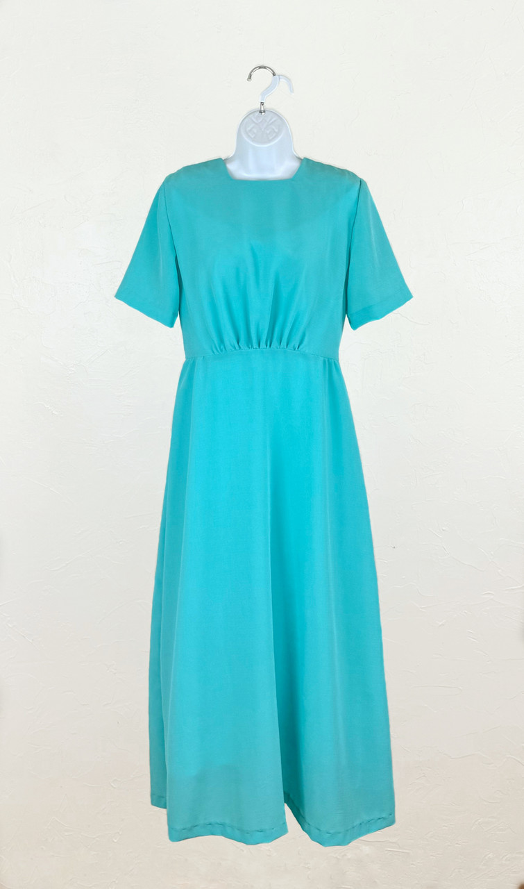 Ladies Polyanna Rose in an aqua blue polyester fabric (slightly crinkled) featuring back sash ties. Available in XS, S, and M. Standard length as per our size charts.