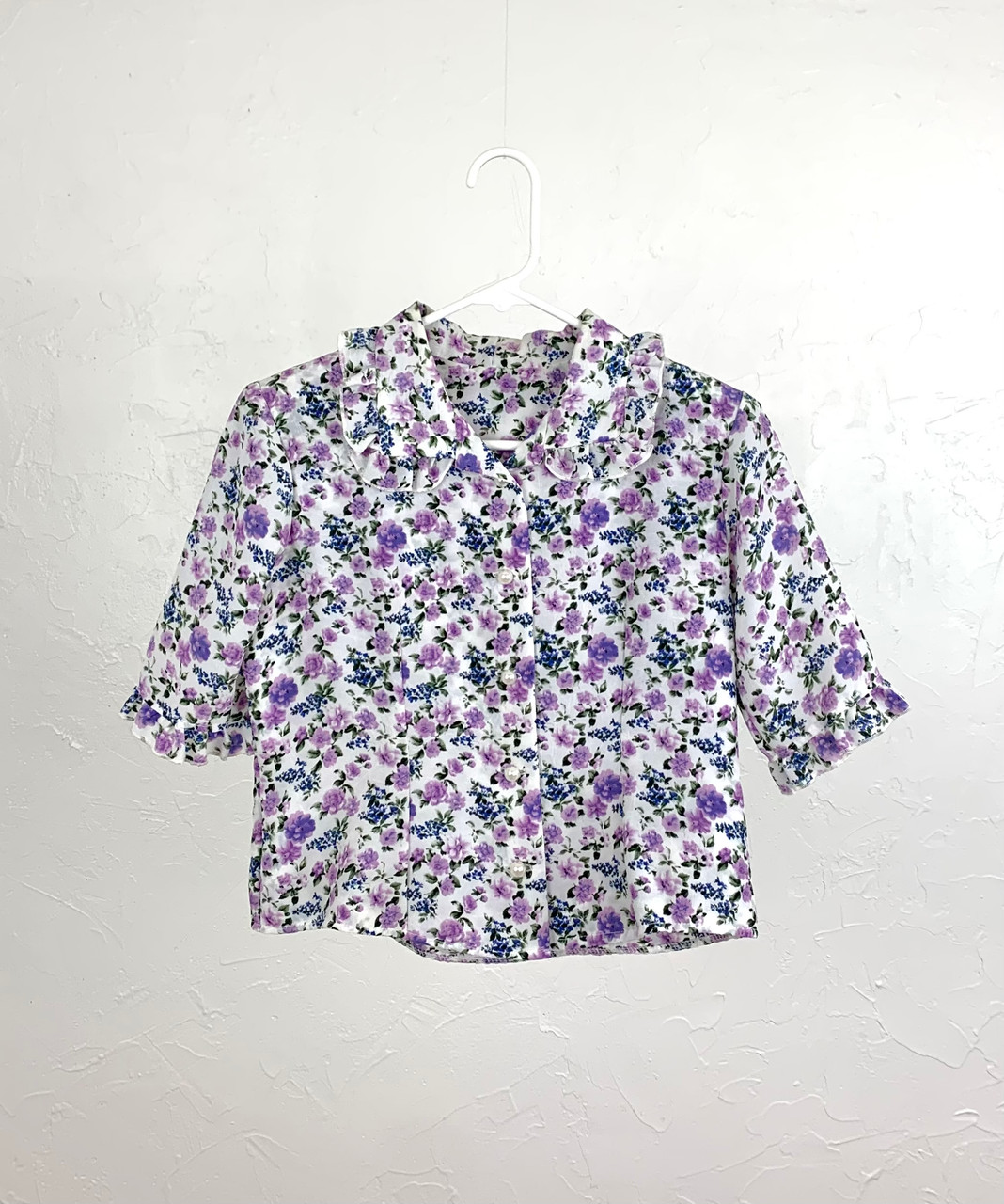 Ladies Florence blouse featuring dark blue and varying shades of purple florals on a white background. Poly-ester fabric. Size XS, but has a very short waist measuring 19" from top to bottom. Has been worn before but in very good condition.